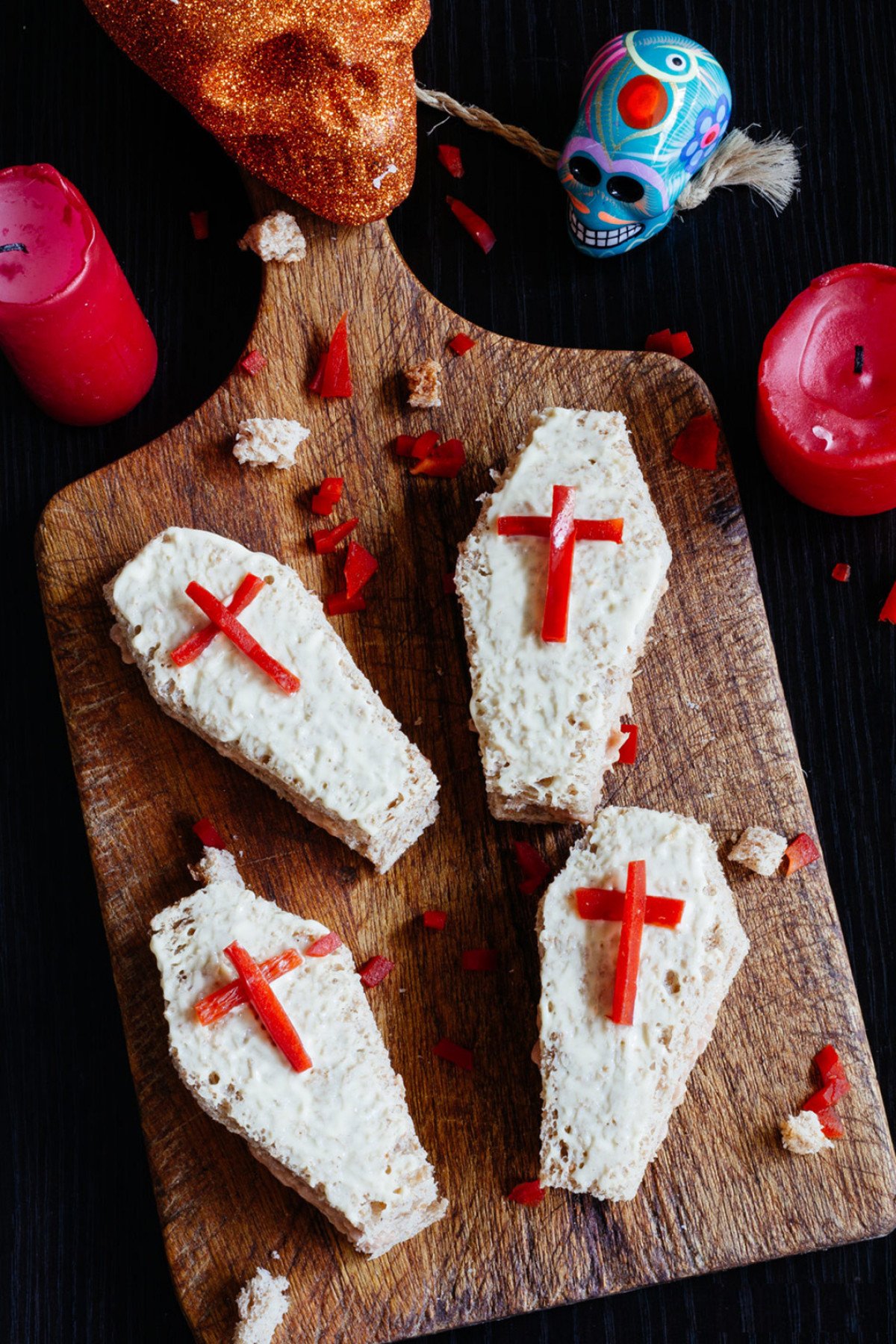 Por último, ¿qué te parece preparar unos sándwiches de pavo con forma de ataúd? Aunque parezcan muy macabros, estos sándwiches de filetes extrafinos de pavo desaparecerán de la mesa en un plis plas. Para esta receta, prepara con antelación el filete a la plancha vuelta y vuelta. Coge las rebanadas de pan de molde y dale forma de ataúd ayudándote de un cuchillo. Rellena el pan con el filete de pavo, lechuga y un poco de mayonesa. Sobre la tapa de arriba, cubre con un poco de queso de untar y decora con tiras de pimiento rojo asado haciendo una cruz sobre el sándwich. ¡El resultado es terrorífico y delicioso al mismo tiempo!