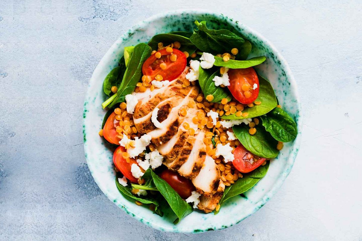 1. Ensalada de lentejas con filetes de pavo marinado en zumo de naranja.