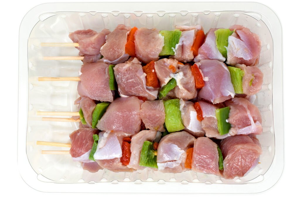 Brined meat from the thigh of the turkey, diced and skewered on wooden sticks with vegetables.