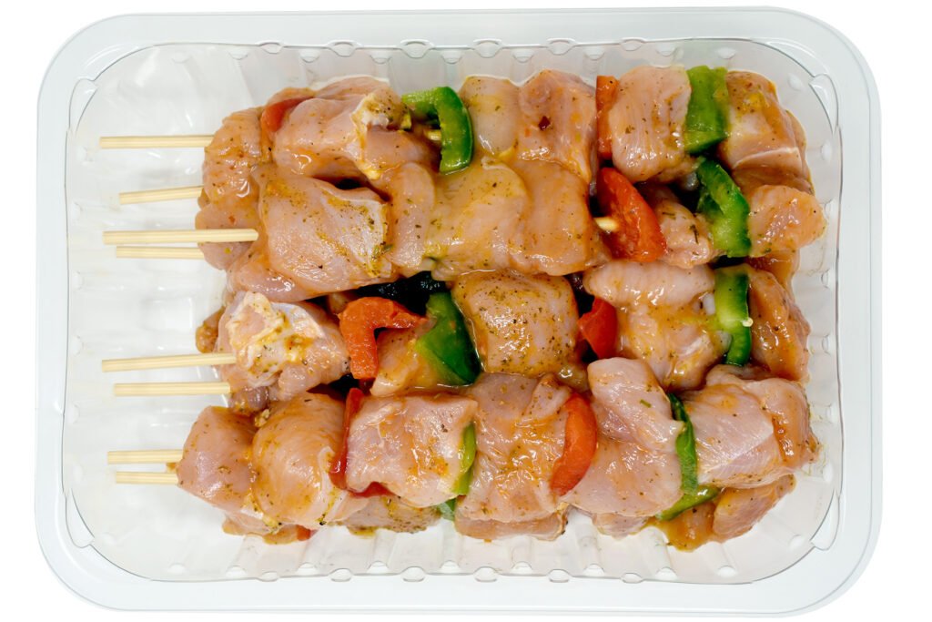 Viande blanche de dinde marinée à la provençale, coupée en dés et embrochée sur des bâtons de bois avec des légumes.