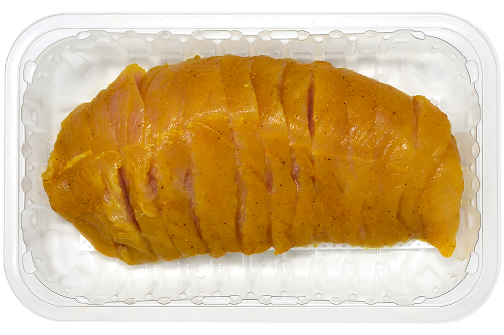 Medallones de solomillo de pavo marinado al curry, pieza procedente de la pechuga del pavo.
