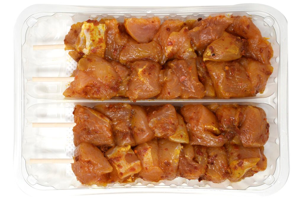 Peso aprox. 355g-550g. Bandeja transparente, envasado en atmósfera protectora. Contiene 4 pinchos por bandeja.